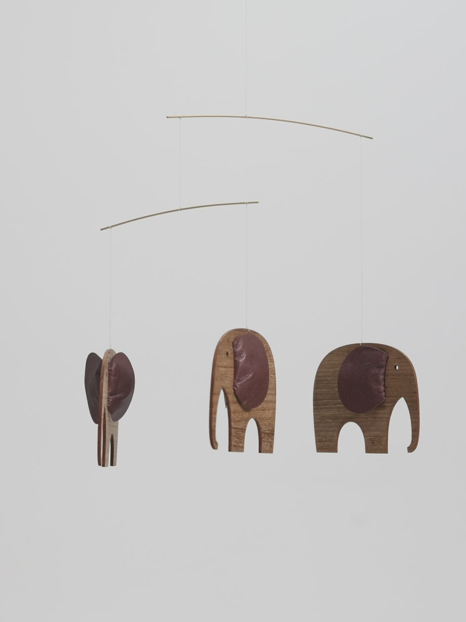 Baby Elephants 3 | Wood is a luxurious mobile crafted from walnut wood, leather, and gold-plated stainless steel bars. The premium materials ensure that the mobile will remain stunning for years to come. It is beautiful hanging object ideal for many rooms in your home— from the living room and bedroom to the children's room and hallway.