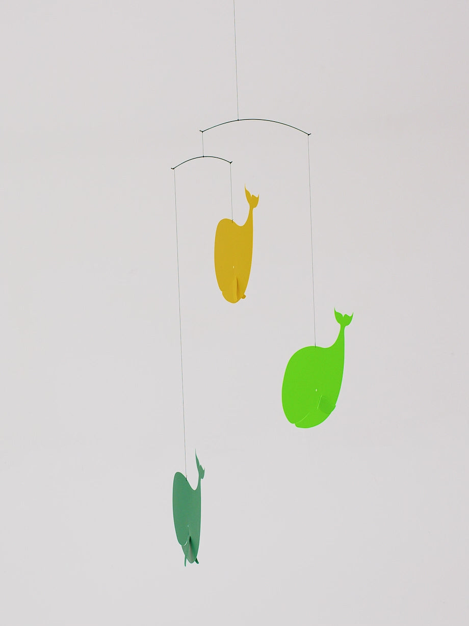 Happy Whales | Yellow & Green was designed by Ole Flensted in 1980 and features three smiling whales in bright colours. Hang it in your children's room as a joyful decorative element.